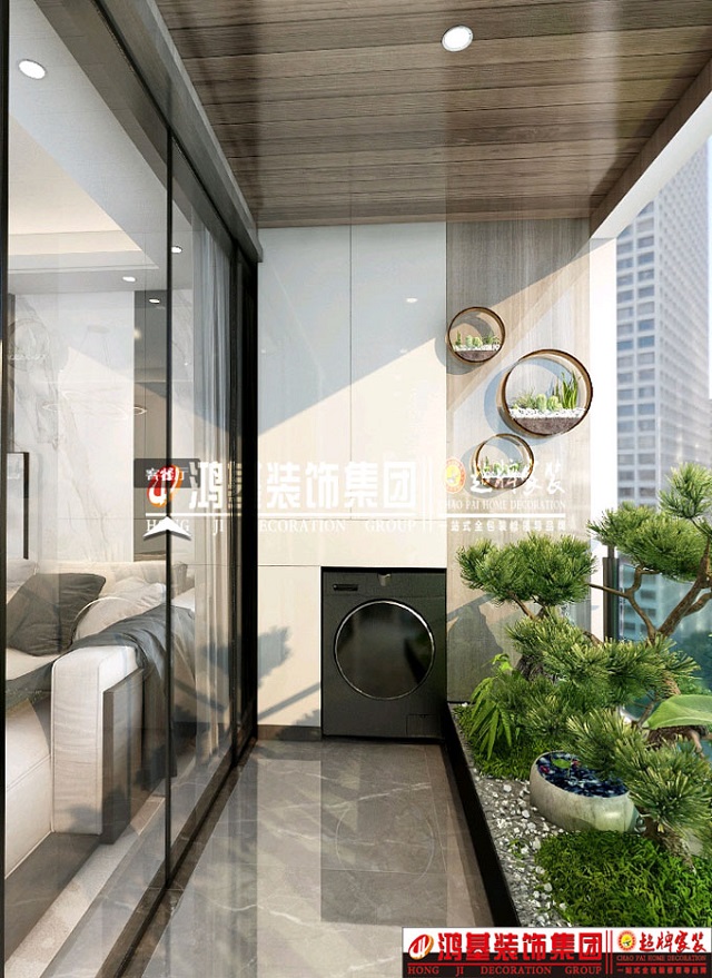 圖4.亮點(diǎn):陽(yáng)臺西側滾筒洗衣機和儲物柜的結合設計,充分利用空間。衛生打掃更加方便,不留死角。 東側留有更多的空間可以培養綠植及休閑,給陽(yáng)臺空間增添生機。